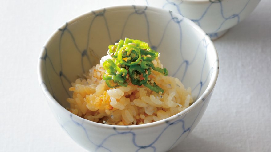 米は洗ってざるに上げ、水けをきる。ボウルに米と【A】を入れ、冷蔵庫で2時間ほど浸水させる。炊飯器の内釜に入れ、ちりめんじゃこを加え、普通に炊く。