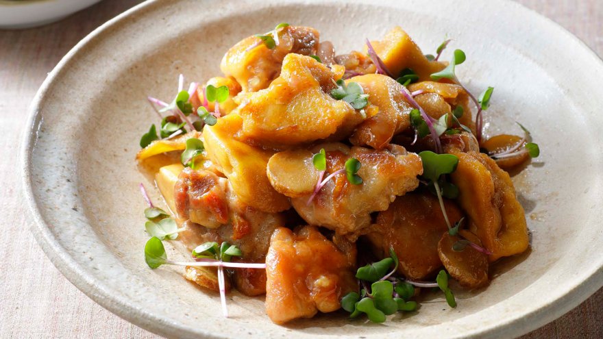 鶏肉と高野豆腐の両面に焼き色がついたら【A】としょうがを加え、ふたをして弱めの中火で7~8分間煮る。途中で1~2度、全体を混ぜる。