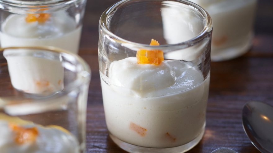1に2を少しずつ加えて泡立て器でよく混ぜる。とろみが出てきたら器に入れ、トッピング用の干しあんずをのせる。冷蔵庫でよく冷やし固める。