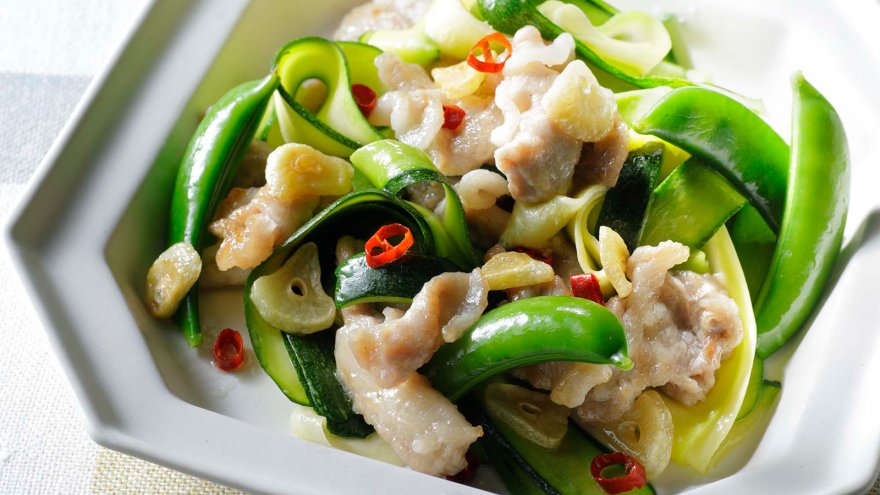 ズッキーニとスナップえんどうのペペロンチーノ風