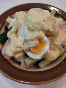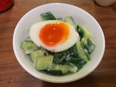 きゅうりのみずみずしさを、スパイシーなヨーグルトソースで味わいます。半熟卵をくずして、からめて召し上がれ。