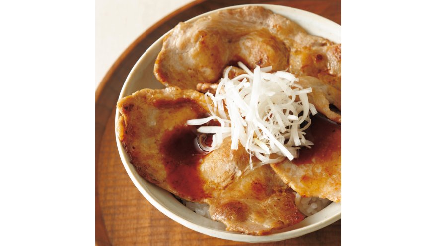 豚肉をシンプルに焼いてのせるだけ。ねぎを中心にのせた花のような盛りつけも食欲をそそります。甘辛いたれが肉にもご飯にもからんでおいしい!