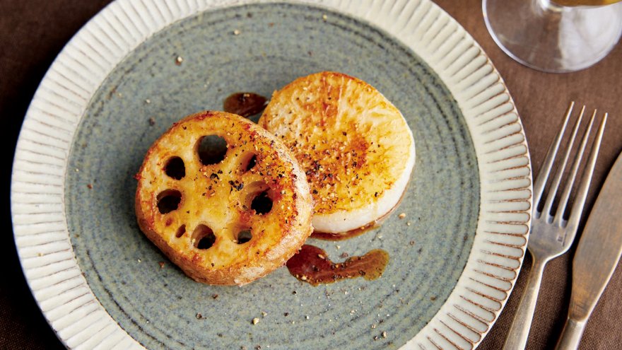 れんこんは皮付きのまま厚切りにして、水にさらさずでんぷん質を生かします。ただただじっくり焼いて、しょうゆと黒こしょうで。