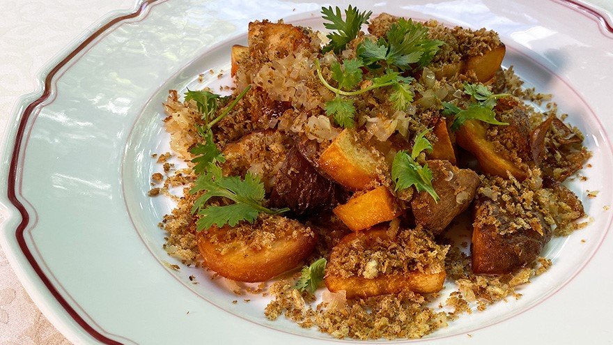 皿に盛り、4のパン粉を振りかける。好みでシャンツァイを散らす。