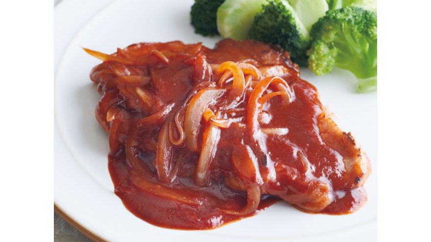 豚肉のソテーにケチャップ味のソースをからめた王道の洋食。かみしめるたびに広がるジューシーなうまみが最高!