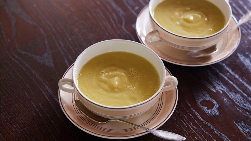 水分量が1/3程度になったら火を止め、牛乳の半量を加え、粗熱が取れたらミキサーにかける。なめらかになったら残りの牛乳を少しずつ加えながら、好みの堅さになるまでかくはんする。鍋に戻し入れて火にかけ、沸騰したら火を止める。味をみて、塩適量、黒こしょう適宜で調える。