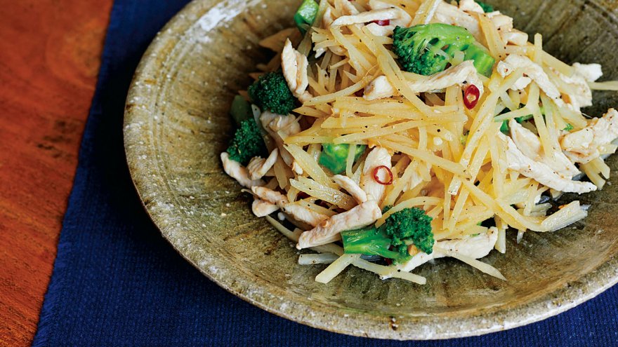 鶏むね肉は細切りにすると、しっとりとして、味がよくからむ。皮は好みで除くか、身と同様に細切りにする。