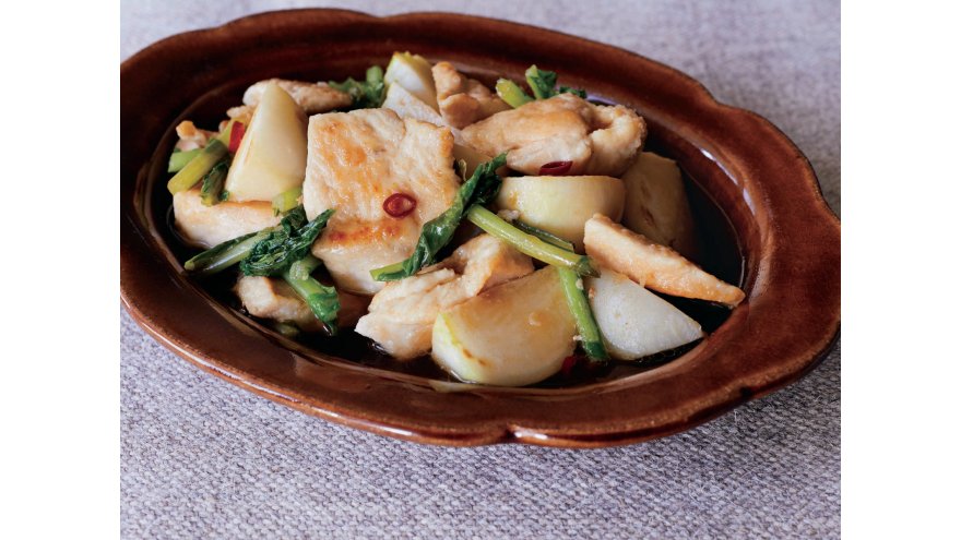 さっぱりとした味わいに、焼いた鶏肉とかぶの香ばしさが引き立ちます。鶏むね肉に小麦粉をまぶすのが、口当たりよく仕上げるコツ。