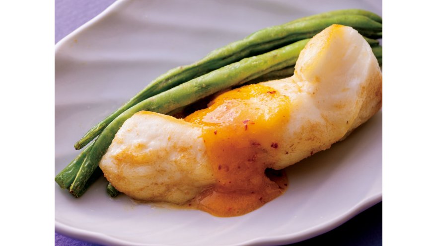 分厚いさくの刺身は、骨がなくて食べやすいムニエルに。卵黄と明太子を混ぜたソースはまろやかで、油のしつこさを感じさせません。