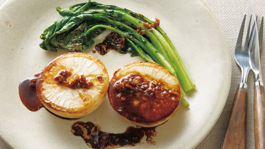 厚切りにしたかぶをこんがり焼いてジューシーなステーキに。にんにく風味のバターじょうゆ味が食欲をそそります。