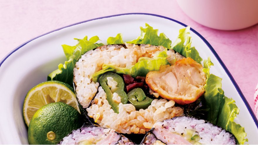 朝ごはんにおすすめの二つ折りでつくるお手軽おにぎり。洗い物が少なく、冷蔵庫の残りおかずを何でも入れられるのが魅力です。ラップごと半分に切って盛りつけると、何とも華やか!