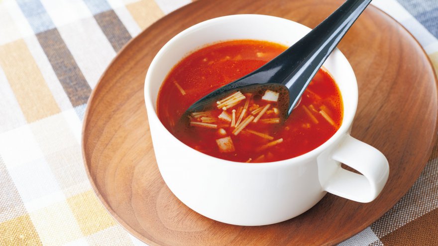すべての材料を耐熱の器に入れたら、あとは電子レンジにおまかせ!えのきだけからいいだしが出て、満足感のあるお手軽スープです。
