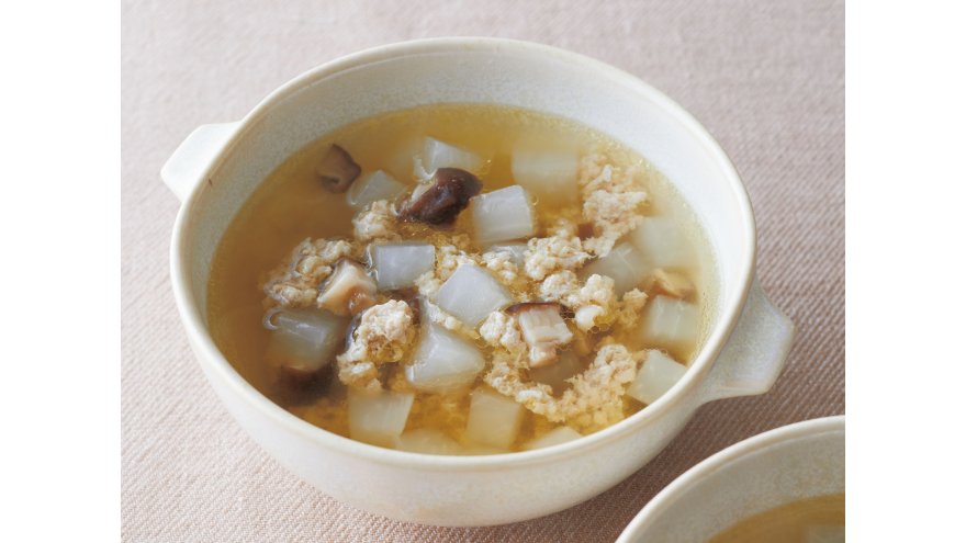 ひき肉から出るあっさりと上品なだしがおいしさの決め手。野菜は小さめの角切りにして、サラサラと口当たりよく!
