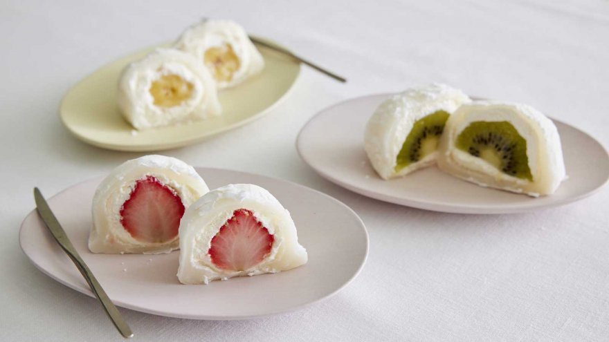 果物はヘタや皮を除き、食べやすく切る(いちごは丸ごとでよい)。ボウルに【A】を入れてハンドミキサーで九分(ぶ)立てに泡立て、ラップに15gほどをのせる。果物を1切れずつのせて包み、冷凍庫に一晩おいて凍らせる。