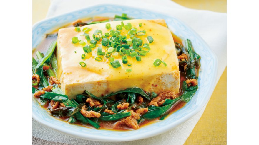 1を弱めの中火にかけてふたをし、豆腐が温まり、にらがしんなりとするまで時々豆腐に煮汁をかけながら8分間ほど煮る(途中でアクを取り、煮詰まりそうになったら水を少量ずつ足す)。