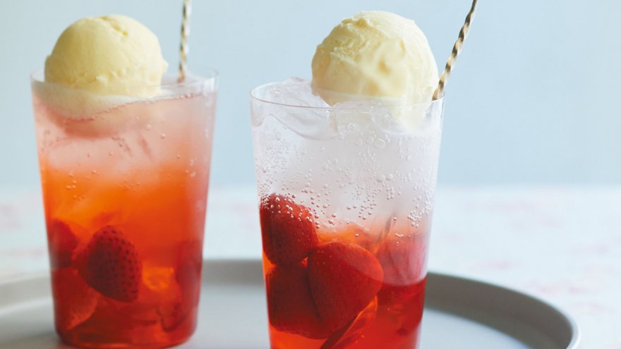 いちごスープを果肉ごとグラスに注いで氷適量を入れ、炭酸水を氷に当てながら注ぐ。