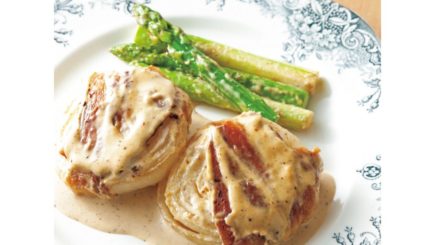 厚切りの新たまねぎに豚肉を巻きつけます。こんがりと焼くことで豚バラの脂がジワッ。生クリームのコクで、濃厚な味わいです。