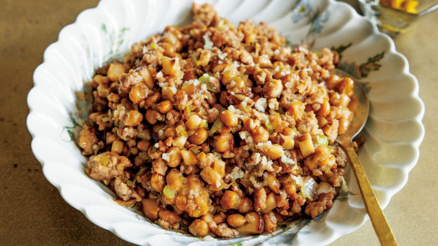 ひき肉はフライパンに入れて、ひと呼吸おいてからほぐしはじめる。焼きつけることで肉のくさみがやわらぐ。