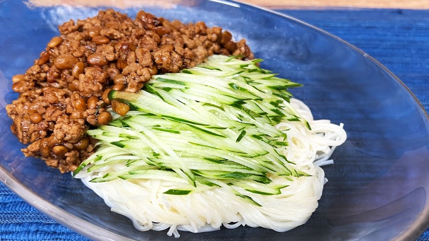 「きゅうり」のみずみずしさをたっぷり味わえる、夏にピッタリの麺。肉みそにはなんと、納豆を加えるのがポイントです!