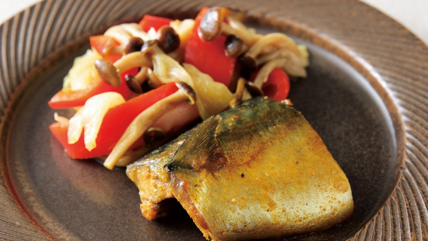 さばにカレー粉としょうゆで下味をつけ、付け合わせの野菜と一緒に冷凍します。解凍はフライパンで酒蒸しに。カレーの風味がさばの濃厚なうまみによく合います。