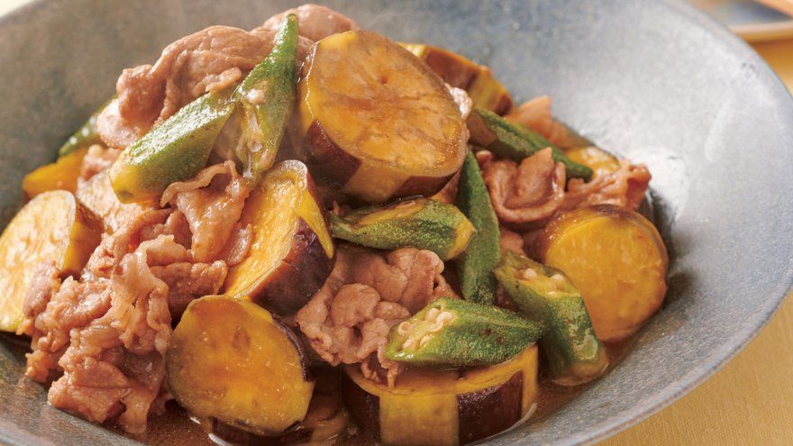 フライパンにサラダ油大さじ3を弱めの中火で熱し、豚肉を炒める。肉の色が変わってきたら、なす、オクラを加えて炒め合わせる。野菜がしんなりしたら【A】を加え、からめながら2~3分間炒める。