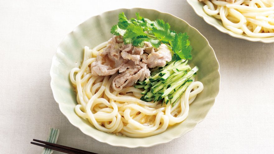 電子レンジで解凍したうどんを冷水にとって冷やします。具の豚肉もレンジにおまかせ。にんにく風味のたれをからめて、パンチの効いたさっぱりうどんです。