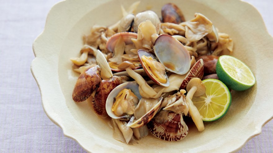 きのこの上にあさりをのせて酒蒸しにすると、あさりのうまみがきのこに行き渡る。