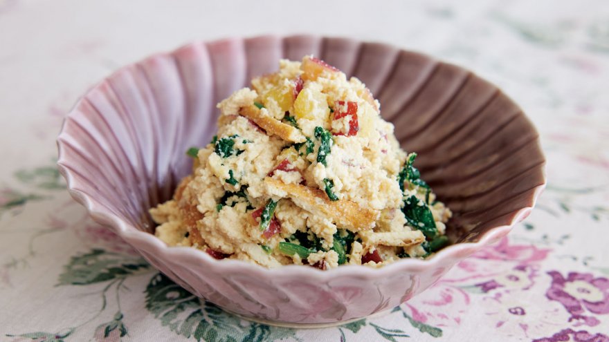 2のあえ衣にさつまいも、汁けを軽く絞ったほうれんそう、2の厚揚げの表面の部分を半量加えてあえる。