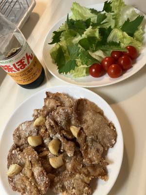 深さのあるフライパンに揚げ油を2〜3cm深さまで入れて180℃に熱し、豚肉を入れる。途中で上下を返してにんにくを加える。4~5分間揚げ、こんがりと色づいてカラッと軽くなったら取り出して油をきる。