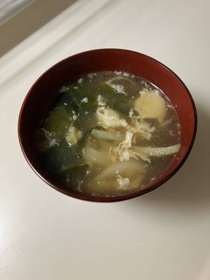 小さめの鍋にごま油小さじ1、薄切りのたまねぎ、1のわかめを入れ、弱めの中火でサッと炒める。水カップ1、【B】を加え、煮立ったら約1分間煮る。卵白はよく溶きほぐして回し入れ、火を止める。