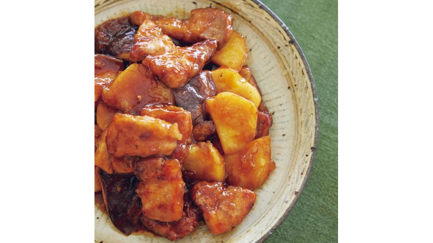 食べごたえありの厚切り豚肉に秋の味覚が合わさり、ボリューム満点!黒酢のまろやかなコクと酸味が、食欲をそそります。