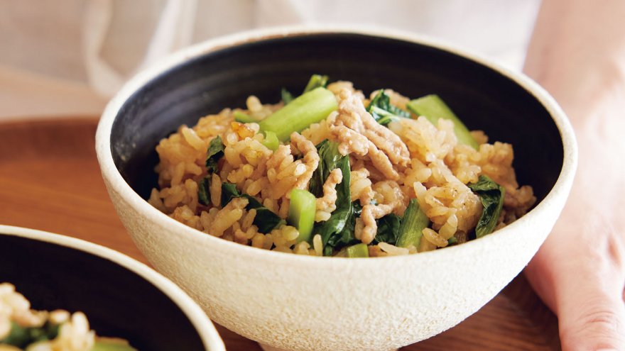 小松菜は2cm長さに切る。炊き上がったご飯に小松菜を散らして加え、ふたをして10分間ほど蒸らす。