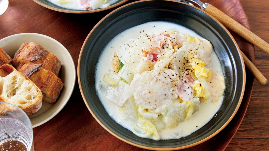 鶏むね肉はしっとり柔らか。ベーコンのうまみとバターのコクで、牛乳だけなのに生クリームを使っているようなリッチな味わいになります。