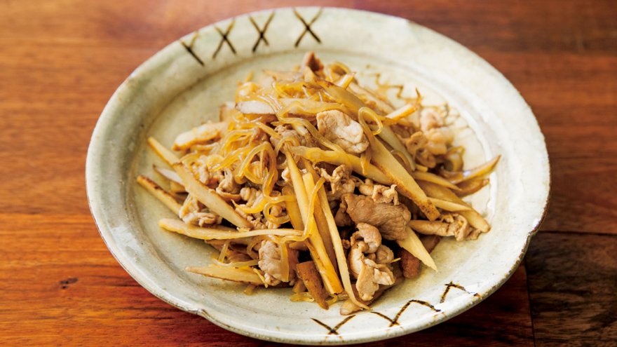 ごぼうはよく洗い、皮ごと縦半分に切ってから斜め薄切りにする。水に5分間ほどさらして水けをきる。糸こんにゃく、豚肉は食べやすく切る。フライパンに湯を沸かし、ごぼうと糸こんにゃくを入れ、4~5分間下ゆでをし、ざるに上げる。