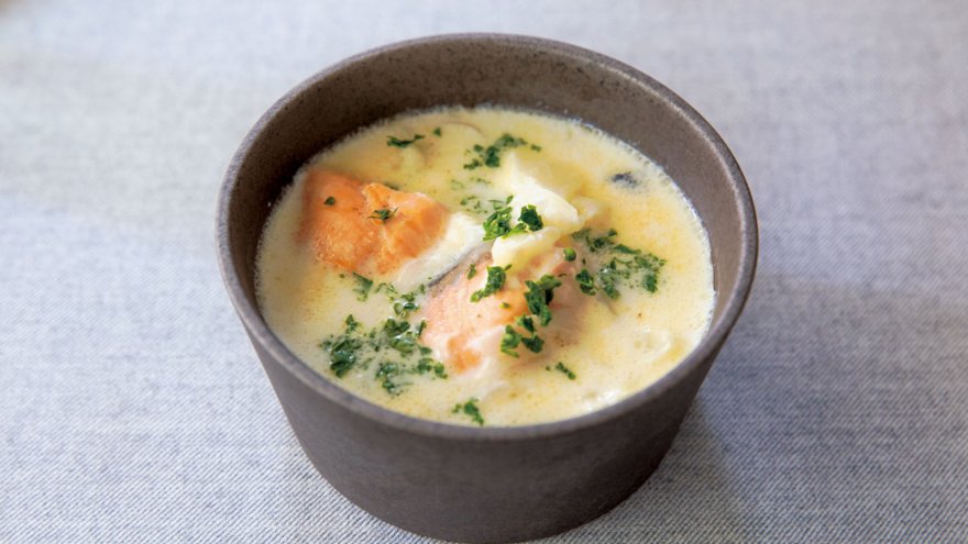 旬の秋さけで、ホッとうれしいシチュー風のスープを。カリフラワーのかわりに、ブロッコリーやじゃがいもでつくっても。