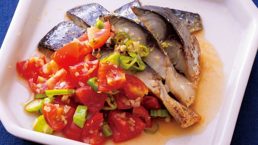 保存がきくパックのしめさばが冷蔵庫にあれば、とっさのつまみに早変わり。香ばしく焼きつけて、フレッシュなソースでいただきます。