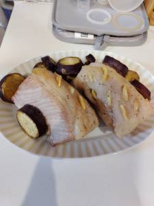 2の豚肉の背脂の部分にバター15gを塗り、さつまいもとれんこんにも残りのバターを少量ずつ塗る。天板に網をのせて豚肉とさつまいも、れんこんを並べ、200℃のオーブンで5分間焼く。扉を開けずに温度を130℃に下げ、1時間焼く。