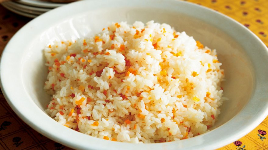 オレンジ色が鮮やかなごちそう仕様のピラフ。ほのかなにんじんの甘みが肉料理にもサラダにもよく合います。