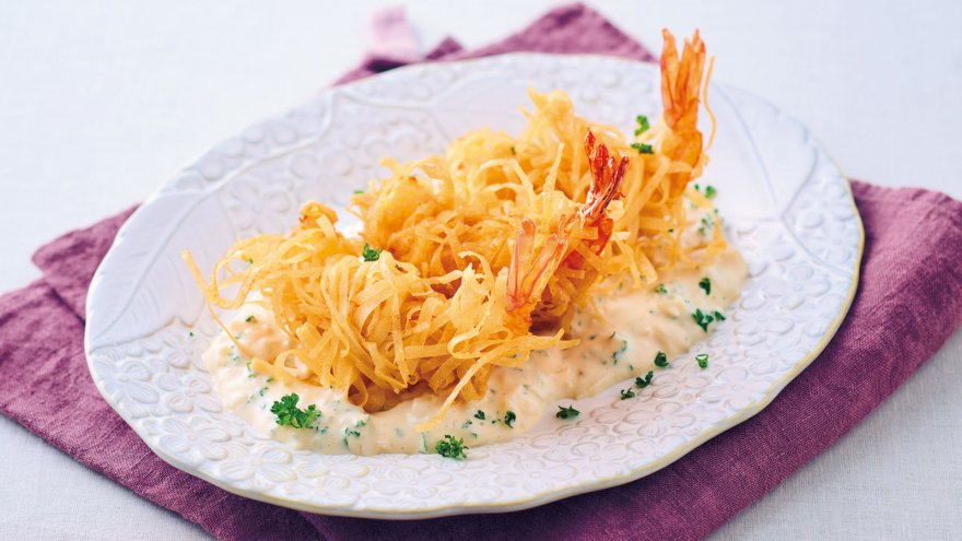 揚げ衣はパン粉ではなく、細切りにした春巻の皮!ユニークな見た目も、驚くほどザクザクの食感も秀逸です。