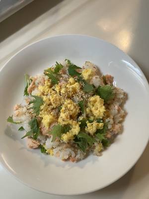ボウルにご飯を入れ、【A】をよく混ぜて回しかけ、しゃもじで切るように混ぜる。ごまを指先でひねりつぶしながら加え、1のさけ、2のいり卵を加え(飾り用適量を残す)、サックリと混ぜる。