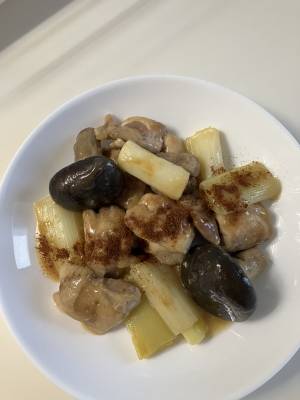 フライパンに米油小さじ1をひき、鶏肉、ねぎ、しいたけを並べ入れ、ふたをして中火にかける。途中様子を見ながら上下を返し、5分間ほど焼いて鶏肉に火を通す。混ぜ合わせた【A】を加え、全体にからめながら、煮汁がなくなるまで煮詰める。器に盛り、好みで粉とうがらしをふる。