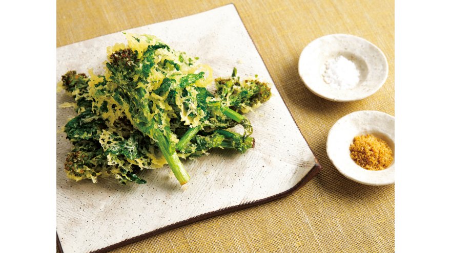 薄い衣をからめて揚げる軽やかな天ぷら。菜の花の香りとカリッとした食感が楽しめます。火が通りやすいので油の温度はやや低め。菜の花のほろ苦さにスパイシーなカレー塩がよく合います。