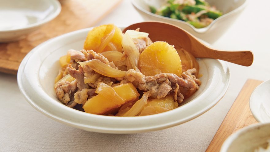 いくら塩分カットのためとはいえ、うす味の料理ばかりが並ぶ食卓は物足りませんよね。香りや食感にも気を配り、おいしいおかずをしっかり味わいながら減塩しましょう。じゃがいもは香ばしく焼きつけ、香りとコクを引き出します。煮くずれしにくく、水分が抜けて中まで味がしみやすくなるのもうれしいポイントです。