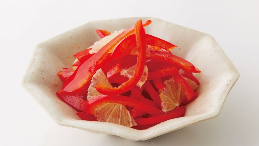 パプリカは四つ割りにし、ヘタと種を除いて細切りにする。レモンは皮をむき、果肉を薄切りにして半分に切る。ボウルにパプリカを入れ、はちみつを加えてよくもみ込む。レモンを加えてあえる。