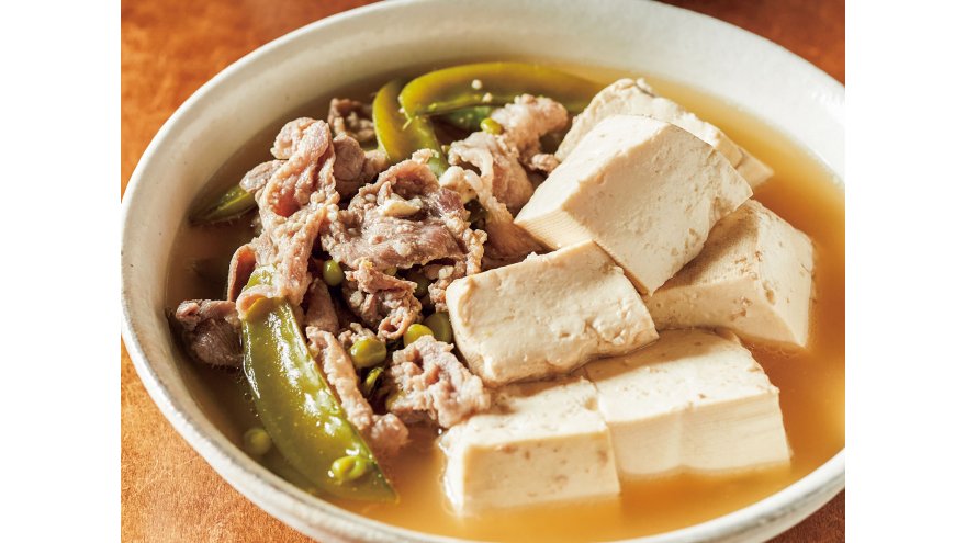 スナップえんどうの歯ごたえを残したいときは、肉と豆腐を煮ている途中で加えるとよい。