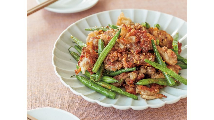 炒めても水けがあまり出ないさやいんげんと合わせて、豚肉のザクッとした食感を保つ。