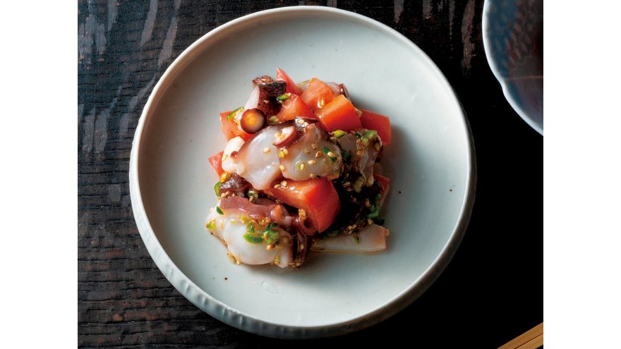 たことトマトをナムル風の味つけで、ご飯もお酒もすすむ小鉢に。ししとうがらしの青さや苦みは大人の楽しみですね。