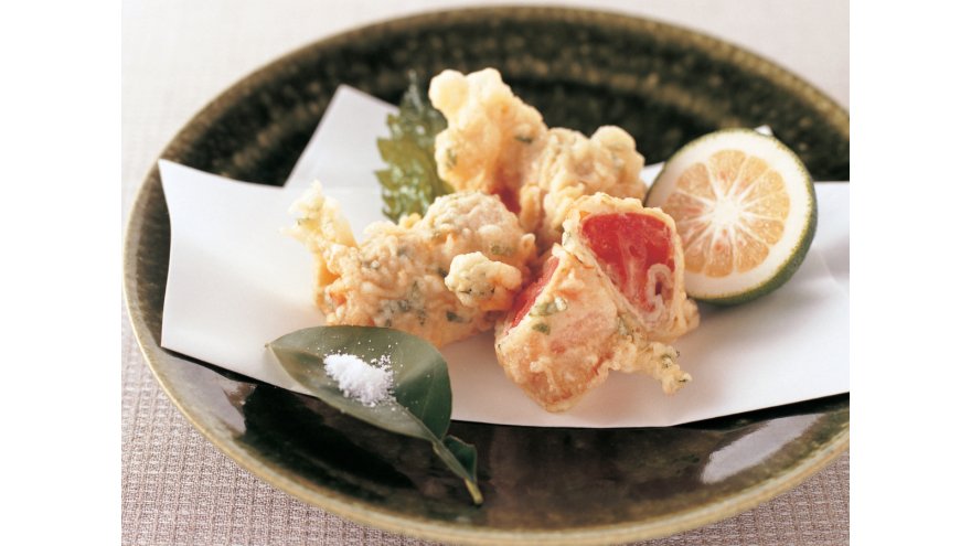 バットにラップを敷き、茶こしで小麦粉をまんべんなくふり、2を並べる。上から茶こしで小麦粉大さじ2をふりかけて、全体にまぶす。3の【衣】をつけて、175℃に熱した揚げ油で、カラッと揚げる。油をよくきり、ようじを抜く。火を止めて150℃程度の油で、青じそを素揚げする。青じそから泡が出なくなったら、引き上げ油をよくきる。