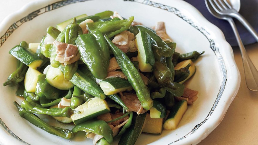 豚肉は3cm幅に切り、塩2つまみをなじませておく。ズッキーニはヘタを切り落とし、ピーマンはヘタと種を除き、それぞれ食べやすい大きさに切る。ししとうはヘタの先を切る。オクラはヘタを短く切ってガクを薄くむき、筋の部分を2~3本そぐ(筋も一緒に炒める)。