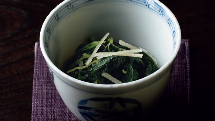 ひんやりなめらかなおひたしに。モロヘイヤのほろ苦さにだしの淡い風味がよく合います。